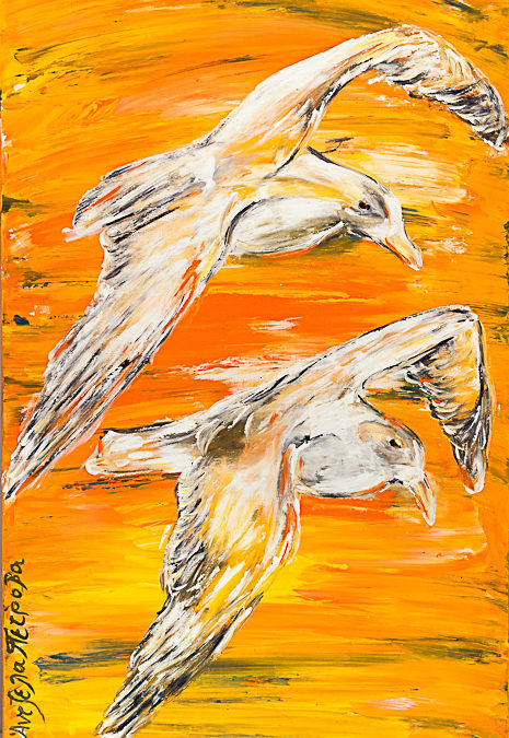 Couple of gulls in Orange on canvas 70×100 by ©Angeliki Petrova